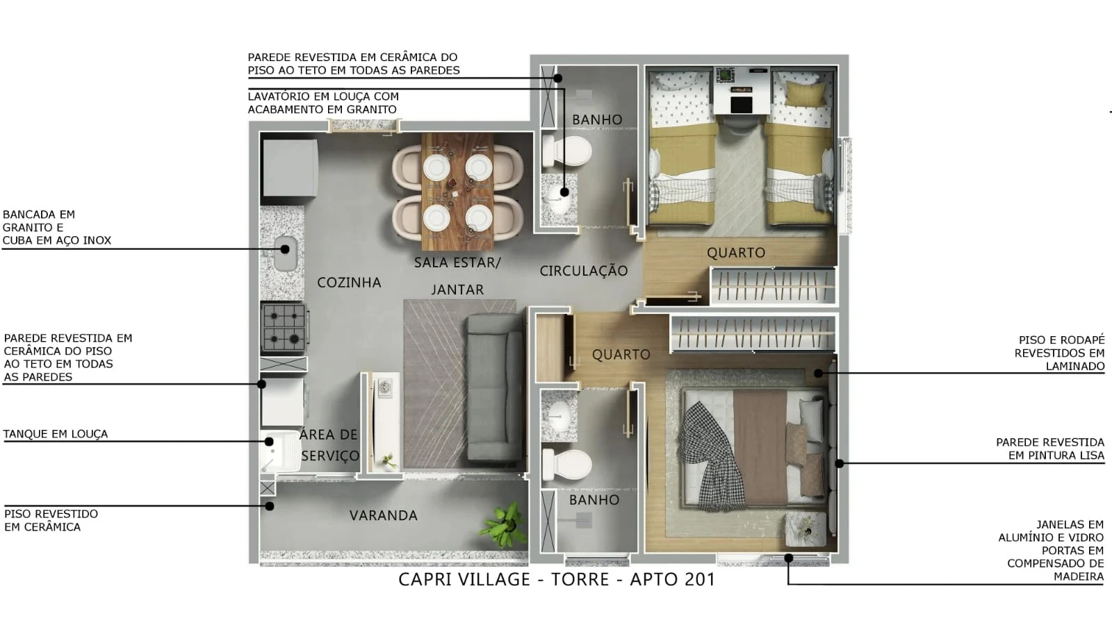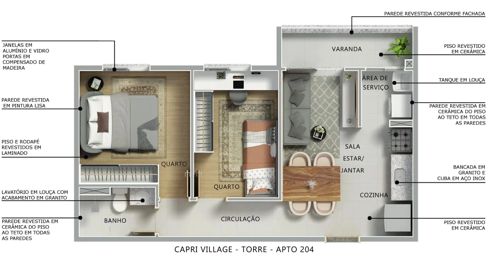 Serão apartamentos de 2 dormitórios com varanda, opção de suíte, 1 ou 2 vagas de garagem e plantas entre 43m² e 44m² — ideal para quem busca funcionalidade sem abrir mão do bem-estar.